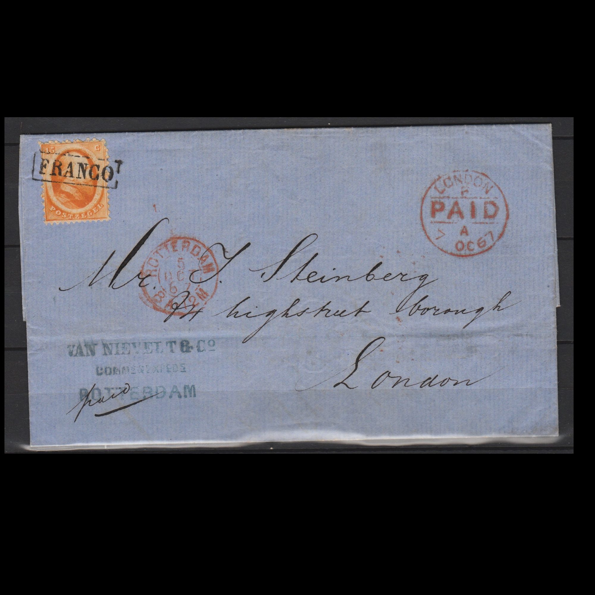 Nederland 1867 6 op brief van Rotterdam naar London met PAID stempel aantal