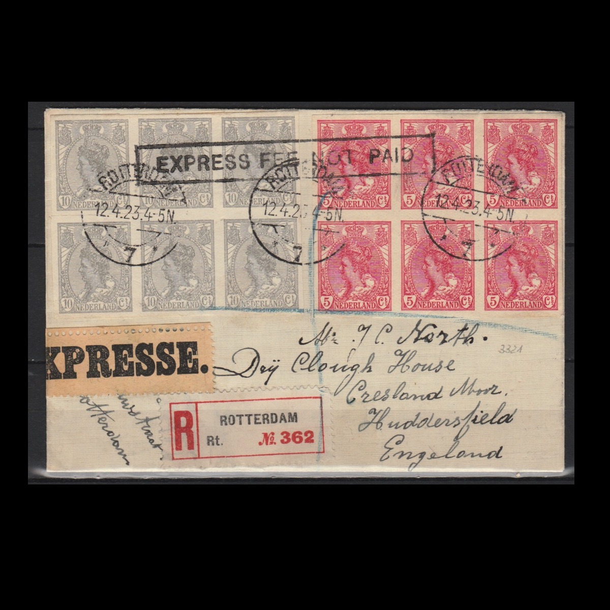 Super mooie brief met Expresse en aangetekende strookjes. Mooi ‘Express Fee Not Paid’ stempel